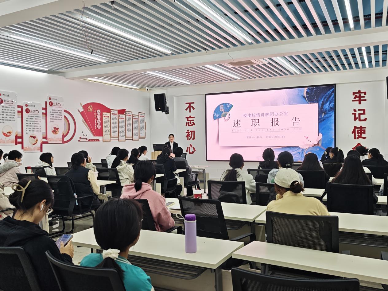 在团干述职环节,团长赵一鸥回顾了过去一年中讲解团开展的各项活动,她以“山山难越山山越,川川无路舟自渡”勉励全体成员继续前行。讲解部部长张婧雨、办公室部长杨祎、宣传部部长朱明雪分别就各部门工作进行了总结与展望,分享了管理经验与成长感悟,并提出了未来工作的改进方向与创新思路。