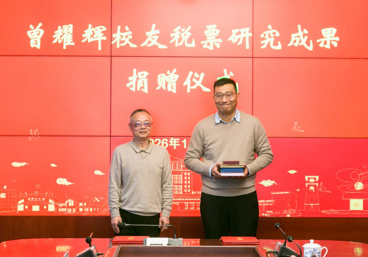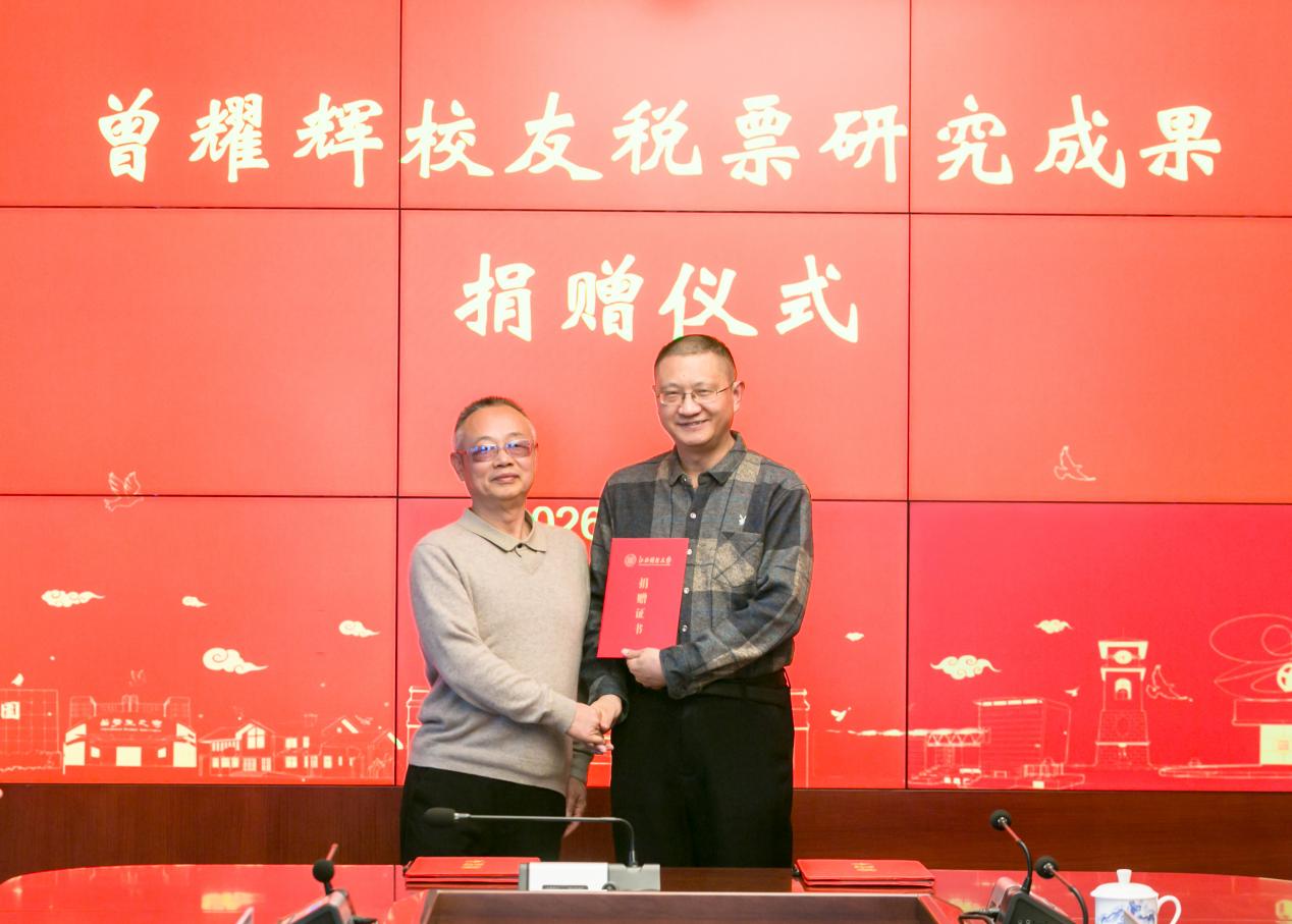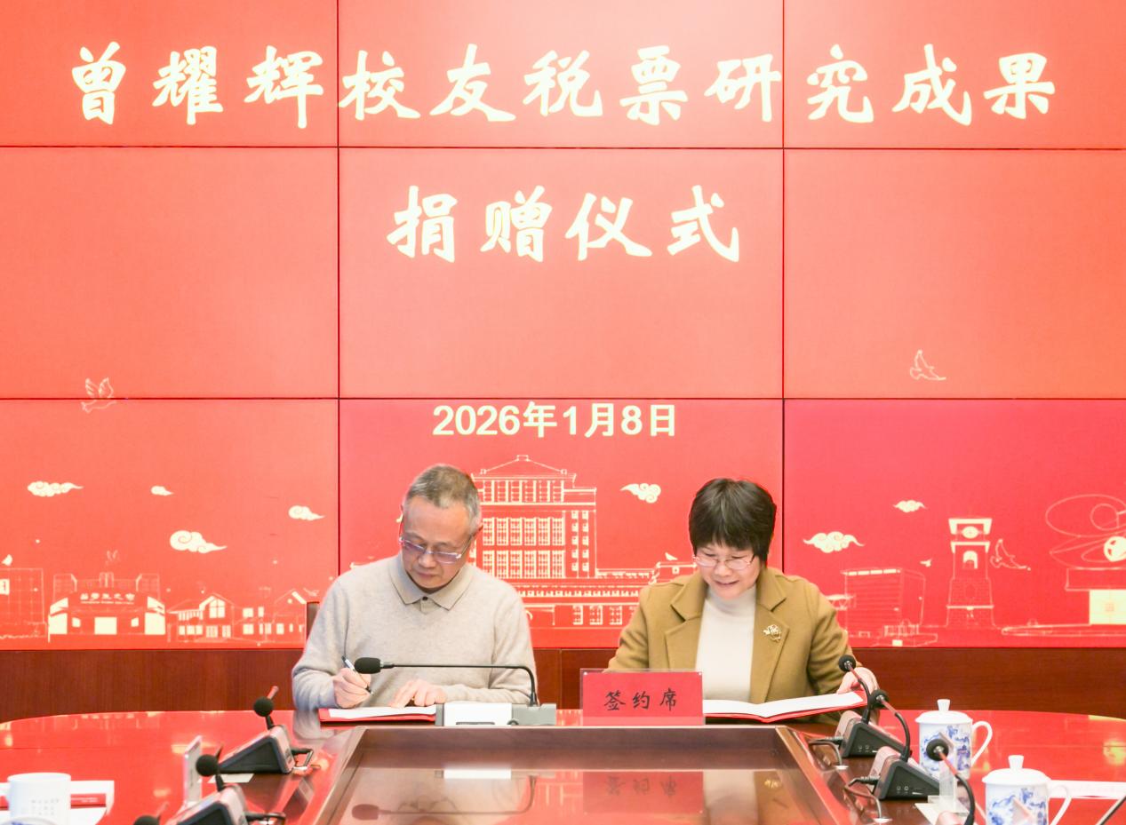 曾耀辉表达了他对母校重视财经文化传统及多年悉心培养的感激之情。母校给予的关怀与支持,始终是他前行路上的重要动力,他也将支持母校学科建设视为自己义不容辞的责任。他表示,税票的收藏与研究是自己毕生投身的事业,此前捐赠税票实物所建成的博物馆,已催生多项学术成果,令他倍感欣慰。此次捐赠,他希望将围绕这批税票文物所取得的研究成果及相关荣誉全部捐给母校,使其形成集典藏、展览、育人和研究为一体的平台和基地。他期盼以此为起点,激励后来者不断探索,使薪火相传、学术永续。